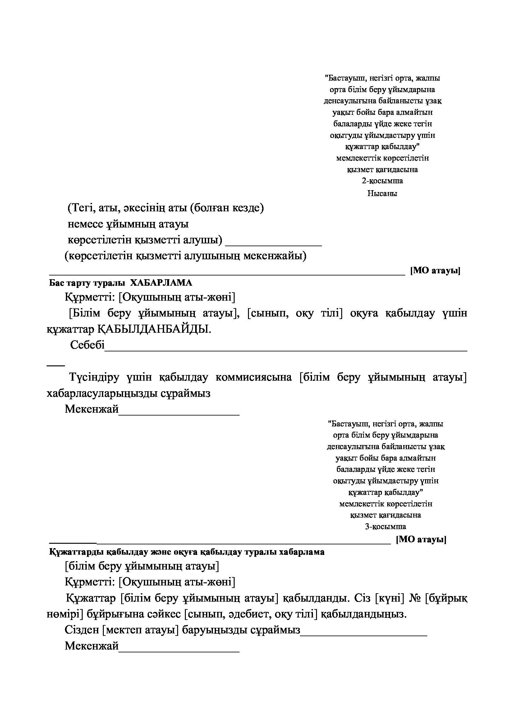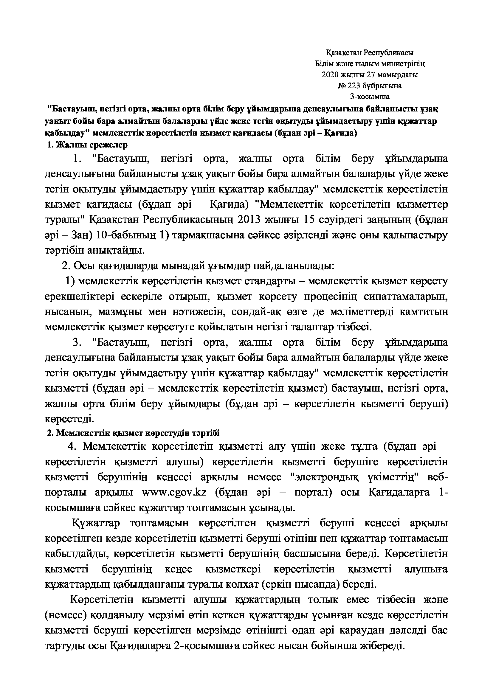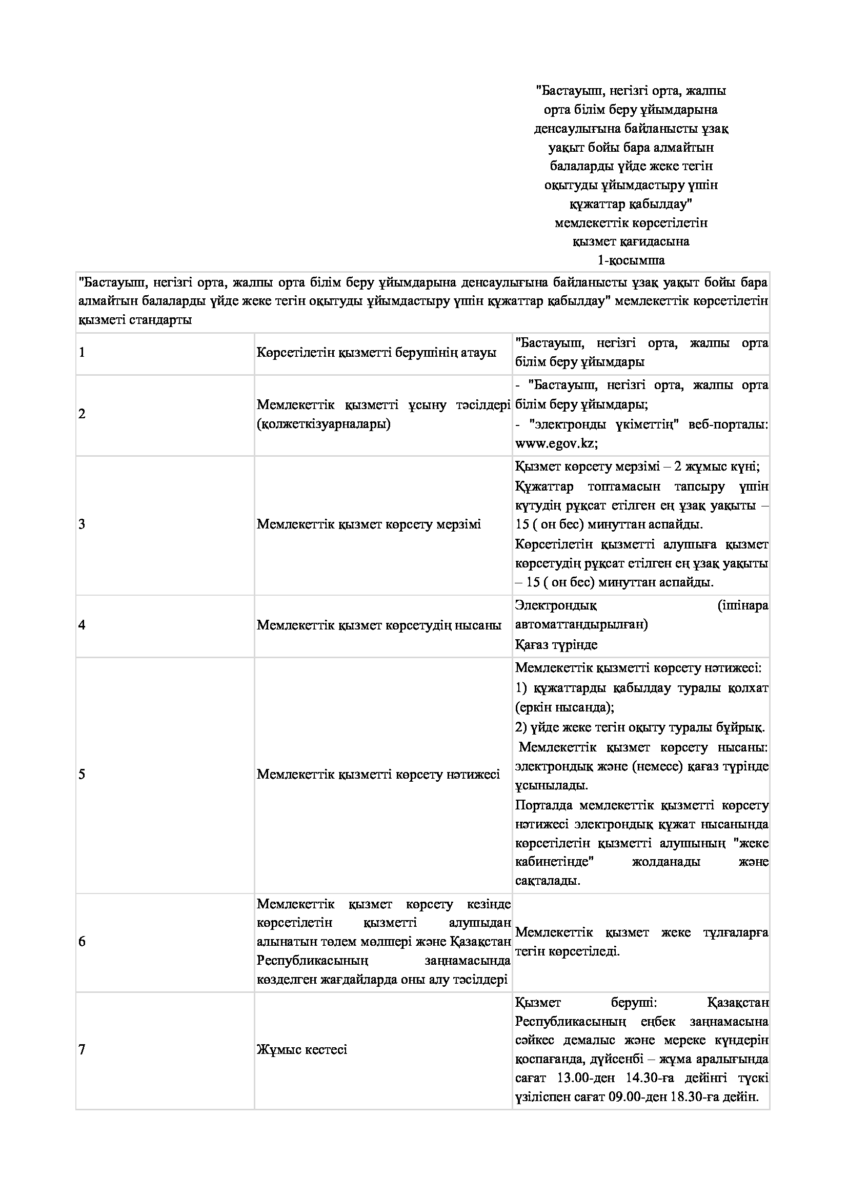 ҚАҒИДА Бастауыш, негізгі орта, жалпы орта білім беру ұйымдарына денсаулығына байланысты ұзақ уақыт бойы бара алмайтын балаларды үйде жеке тегін оқытуды ұйымдастыру үшін құжаттар қабылдау