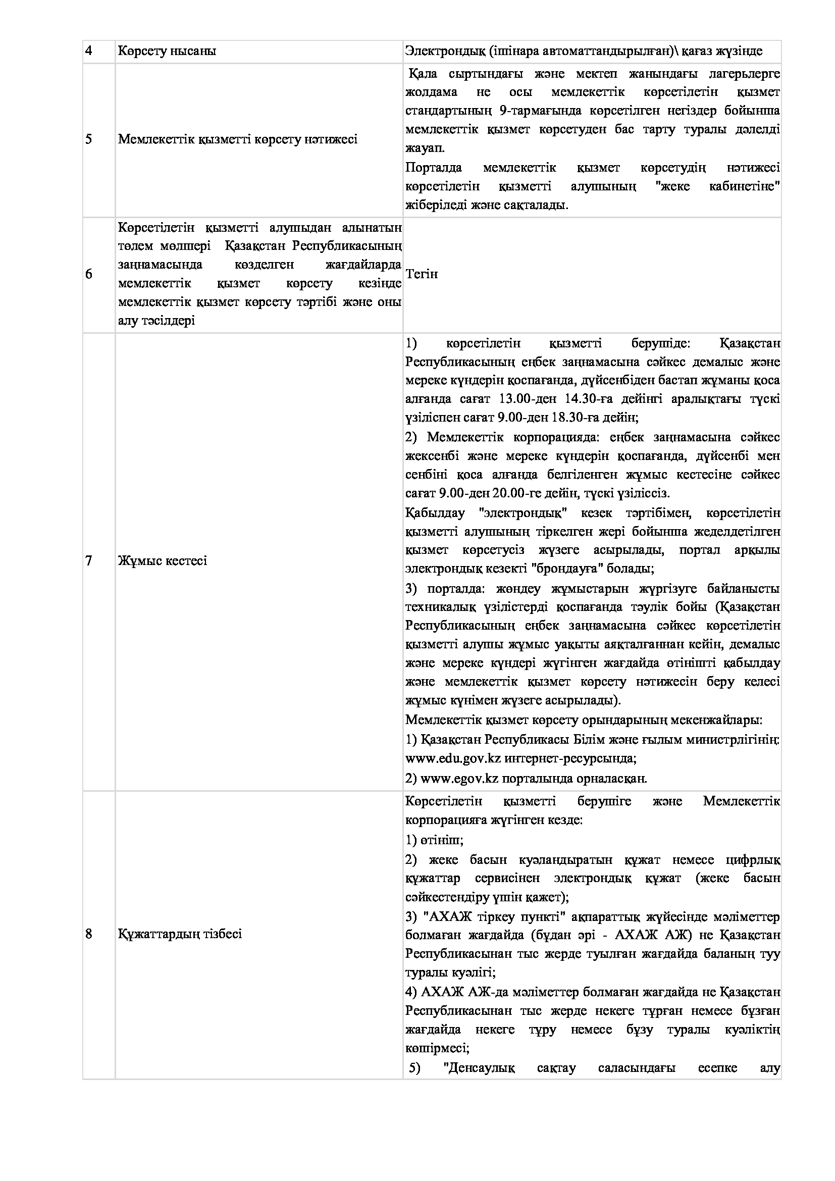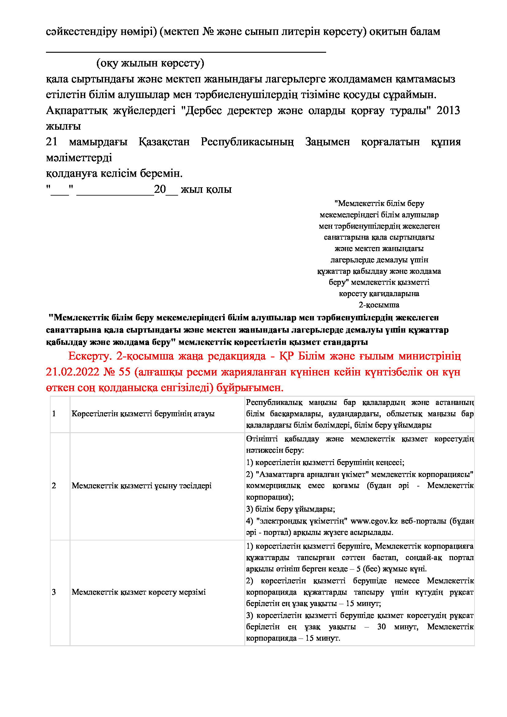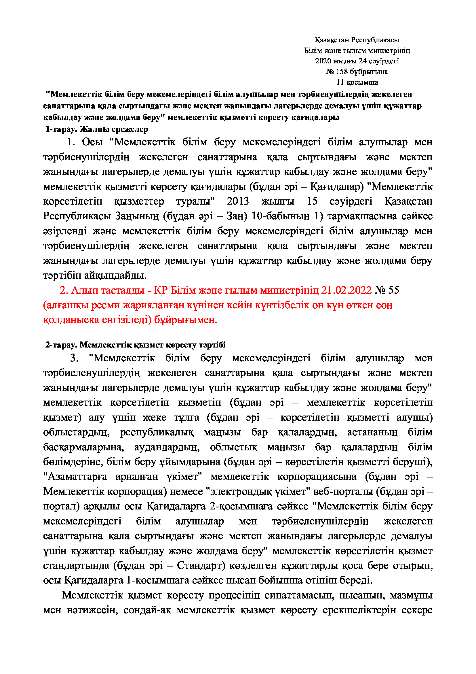 ҚАҒИДА Мемлекеттік білім беру мекемелеріндегі білім алушылар мен тәрбиенушілердің жекелеген санаттарына қала сыртындағы және мектеп жанындағы лагерьлерде демалуы үшін құжаттар қабылдау
